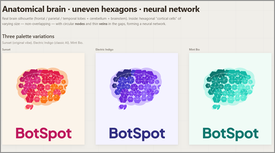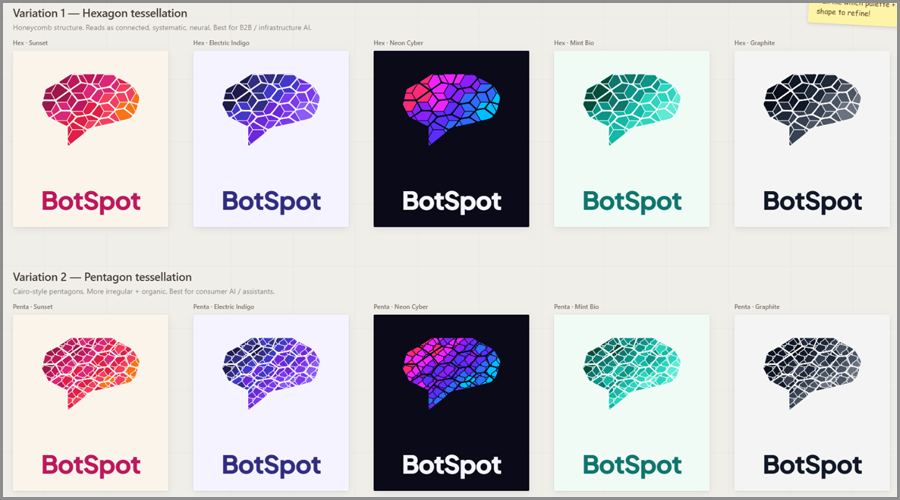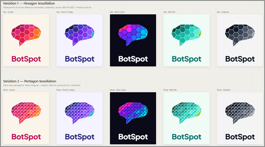 Prompt: “I want to create a logo for my product, BotSpot. I have attached a reference image. I want variations in that, like instead of triangle shapes designed in the logo, I want 1 Hexagon Variation design and 1 Pentagon variation design. For each variation, I want to color 5 variations that are best for the AI product logo. Here is my product info https://botspot.us/”
